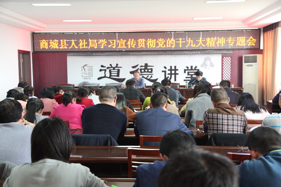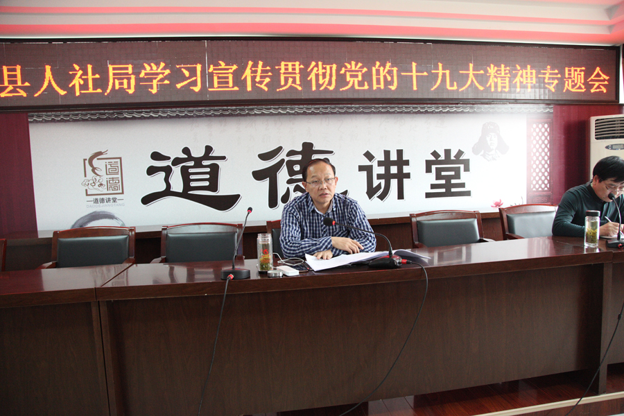 为迅速将党的十九大精神传达到每名人社干部职工,进一步提高认识、统一思想、凝神聚力,11月3日下午,县人力资源和社会保障局在局五楼大会议室召开了全体党员干部大会,专题学习党的十九大精神,部署人社部门宣传贯彻落实工作。