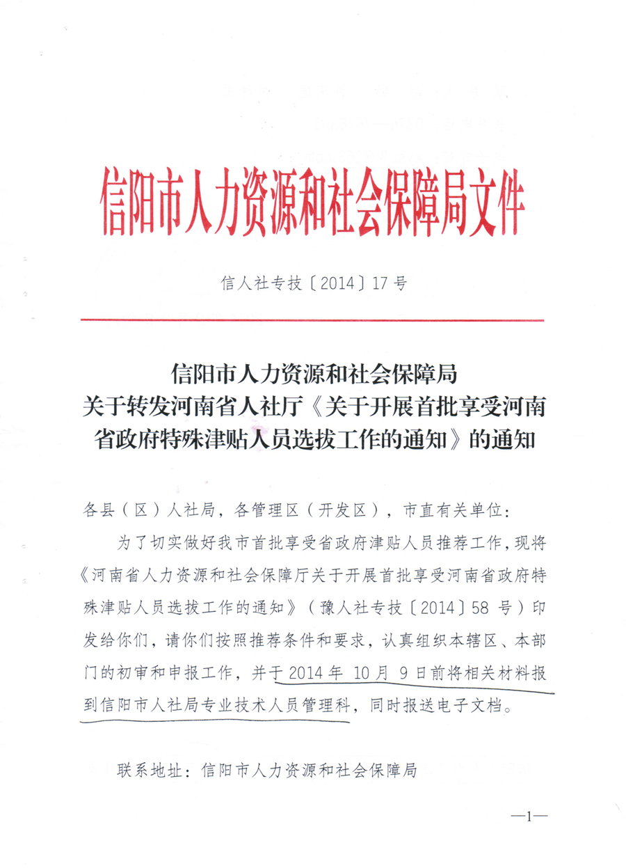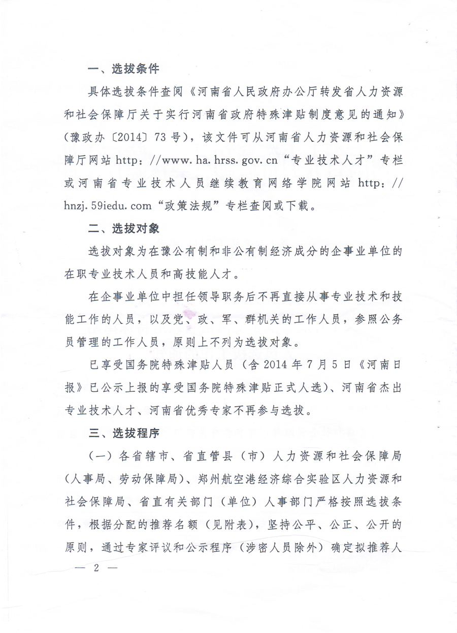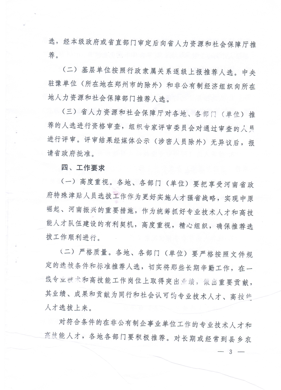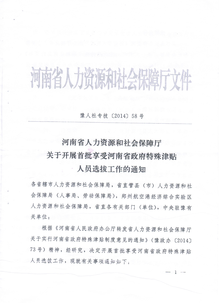 河南省人社厅关于开展首批享受河南省政府特殊津贴人员选拔工作的通知