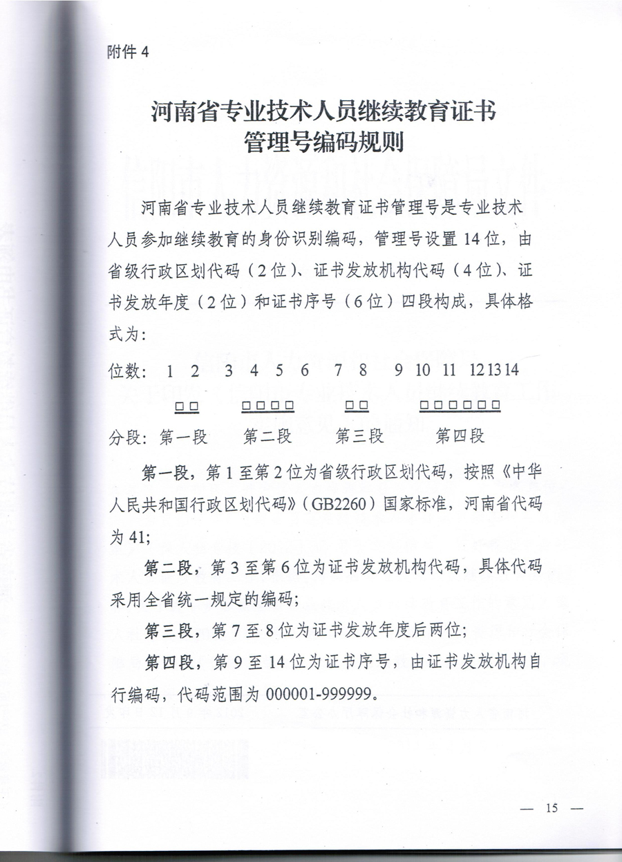 第七条 各省辖市人力资源和社会保障局、省直各单位人事(继续教育管理)部门,按照《河南省专业技术人员继续教育证书管理号编码规则》(见附件)的要求,负责本辖区、本部门继续教育证书的申领、编号、备案、审验和发放管理工作。